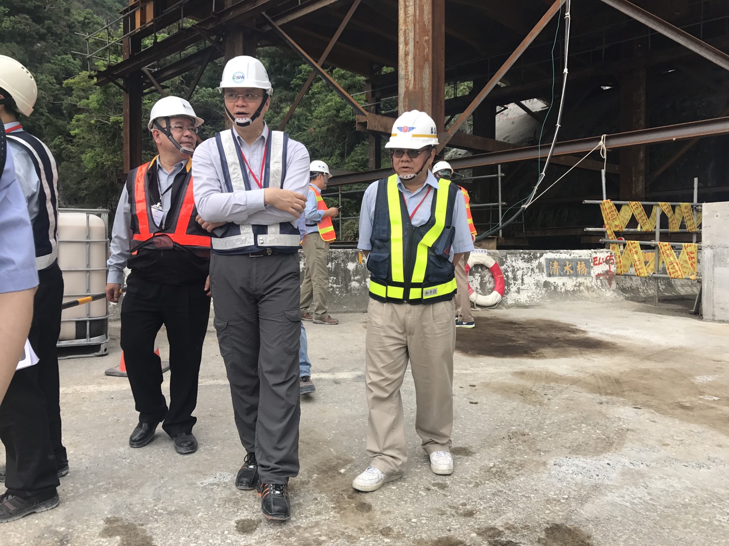 勞動部職業安全衛生署鄒署長與交通部公路總局蘇花公路改善工程處邵處長,於107年4月12日帶隊至「交通部台9線蘇花公路山區路段改善計畫」(蘇花改工程),實施公共工程安全衛生自主管理聯合稽查。