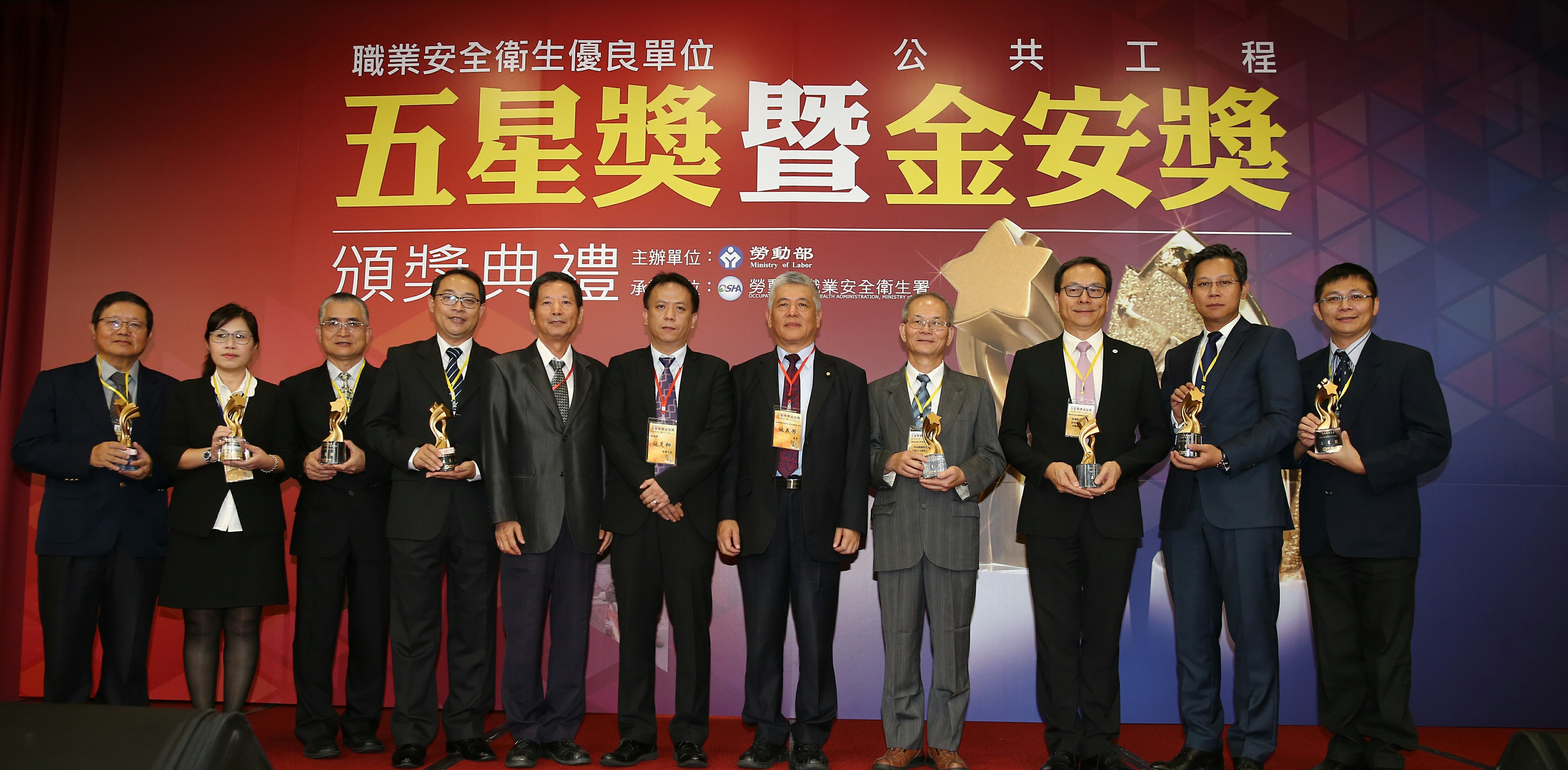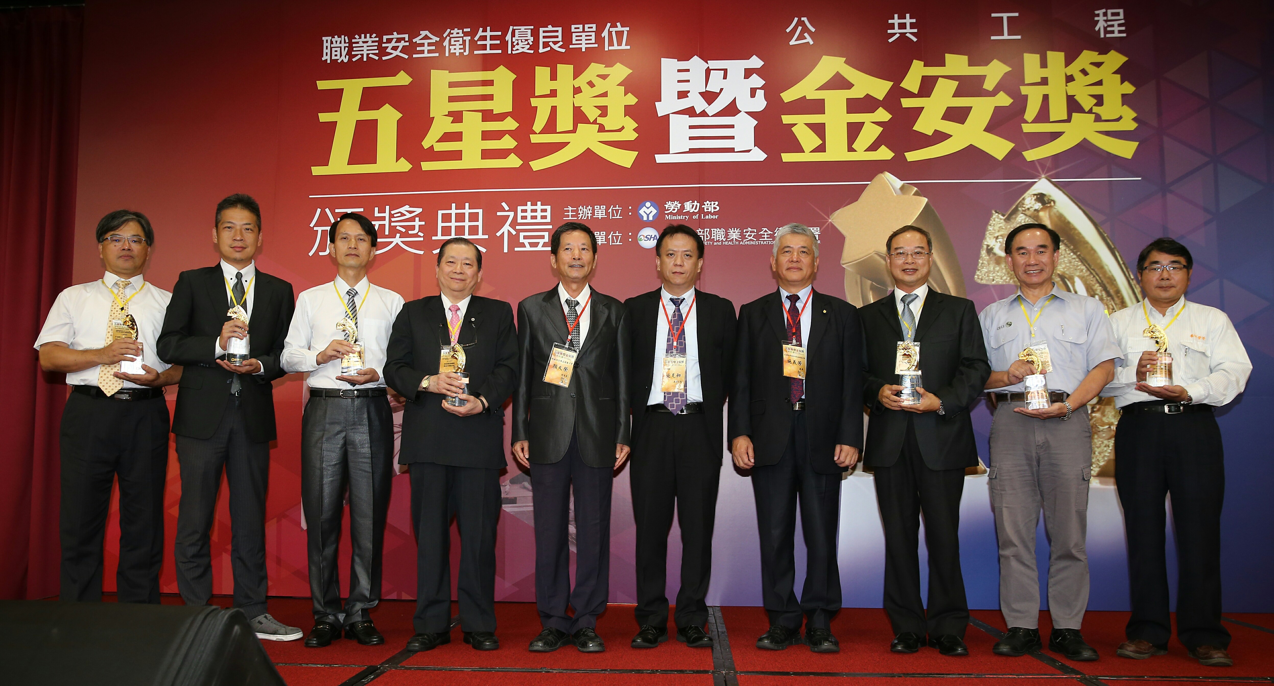 今年度優良單位五星獎共計8個事業單位獲獎,其中漢翔工業股份有限公司發動機事業處長期致力於職業安全衛生管理業務推動,建立安全、健康、快樂及友善的職場,已經是第4次獲得五星獎;中鴻鋼鐵股份有限公司熱軋廠制定「工安十二條規定」請員工及承攬商主動背誦及落實,並激勵全員參與工安,樹立企業專有安全文化;台灣松下電器股份有限公司基於「對人尊重」精神,致力實現「安全及有益身心健康的舒適工作職場」目標,以滾動式檢討精進其安全衛生政策。