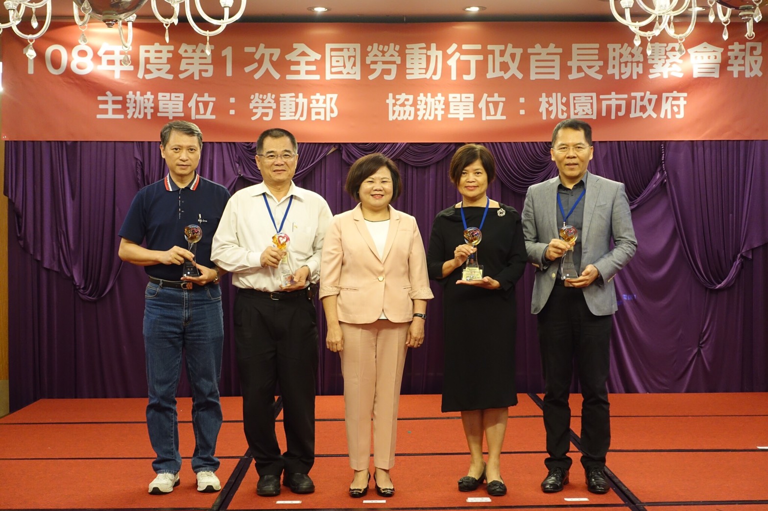 108年度職災勞工個案主動服務計畫評鑑-第一組優等獎得主:新北市陳瑞嘉局長、臺南市王鑫基局長、勞動部許銘春部長、臺北市徐玉雪副局長、高雄市王秋冬局長(由左至右).jpg