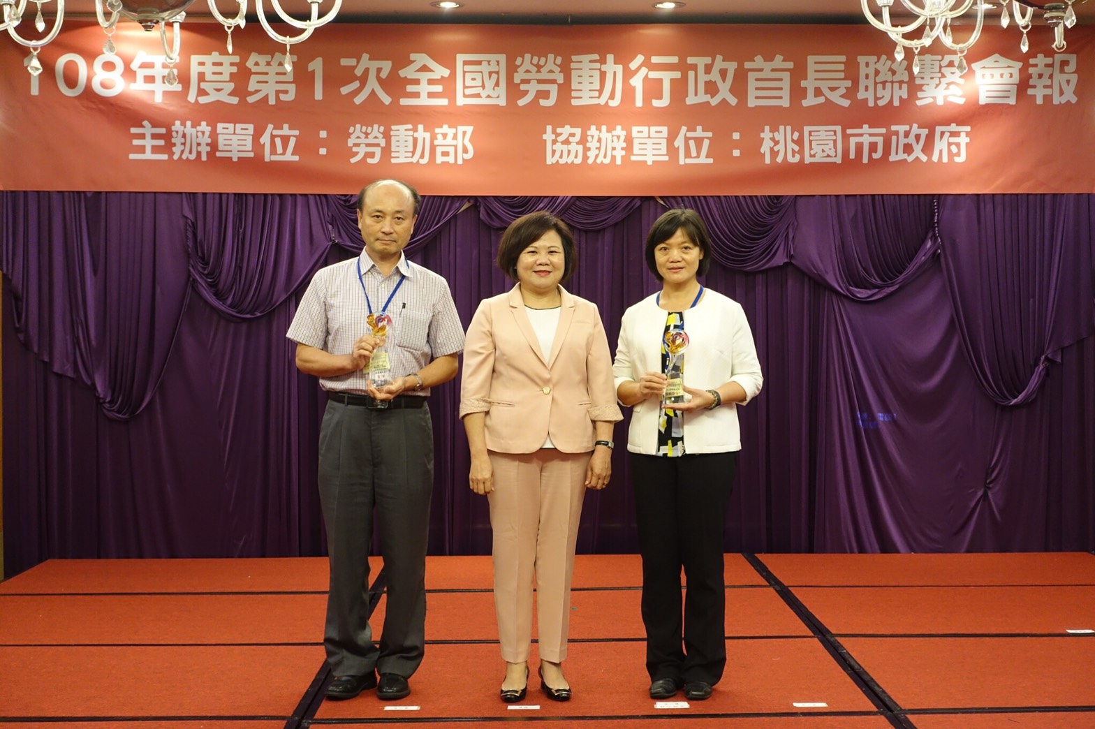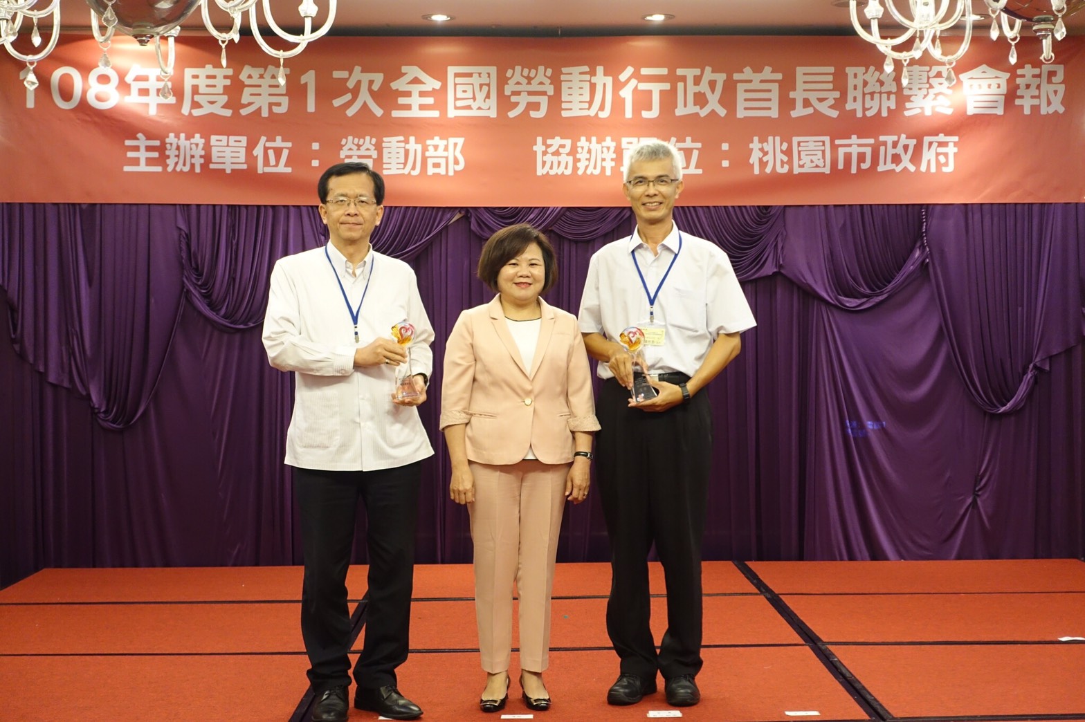 108年度職災勞工個案主動服務計畫評鑑-第二組優等獎得主:南投縣林志忠處長、勞動部許銘春部長、彰化縣吳蘭梅處長(由左至右).jpg