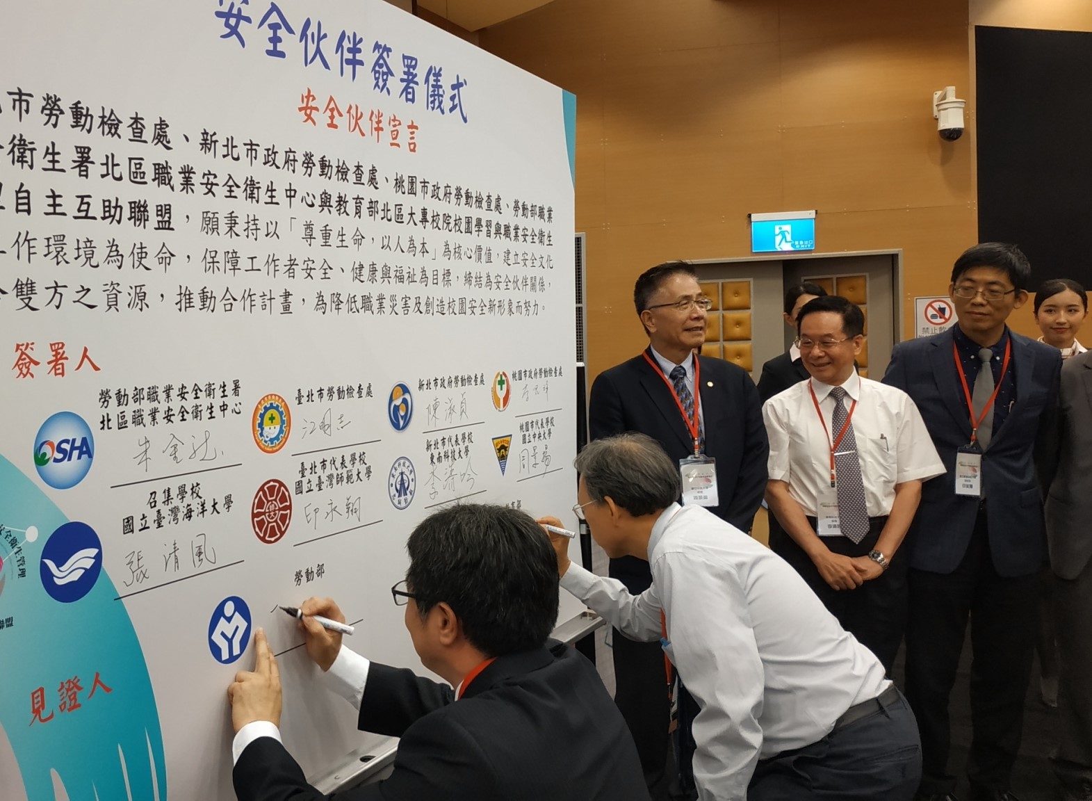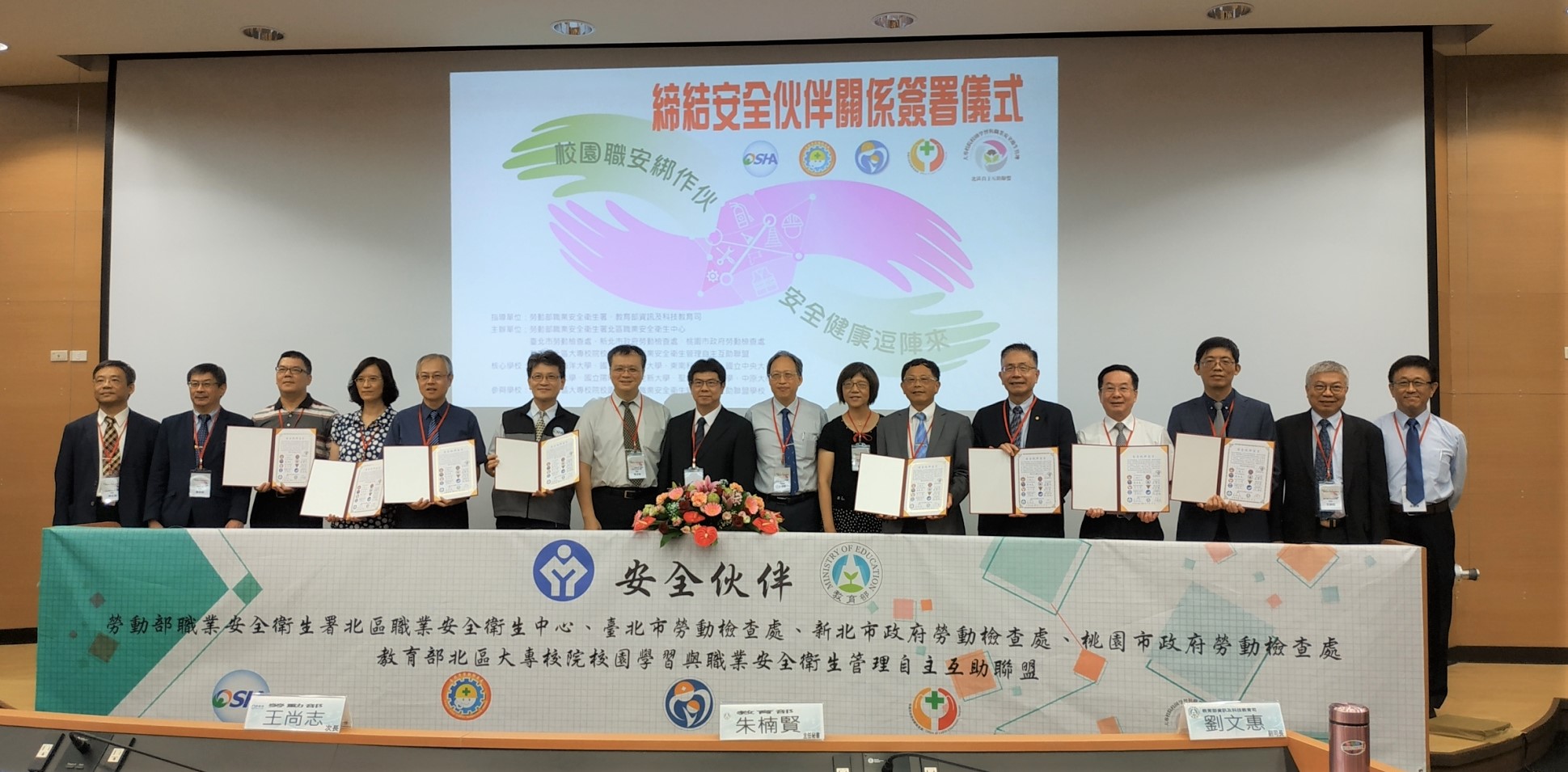 勞動部職業安全衛生署北區職業安全衛生中心、臺北市勞動檢查處、新北市政府勞動檢查處、桃園市政府勞動檢查處與北部地區計69間大專校院組成之安全衛生互助聯盟,今(17)在勞動部王政務次長及教育部朱主任秘書之見證下締結安全伙伴關係。