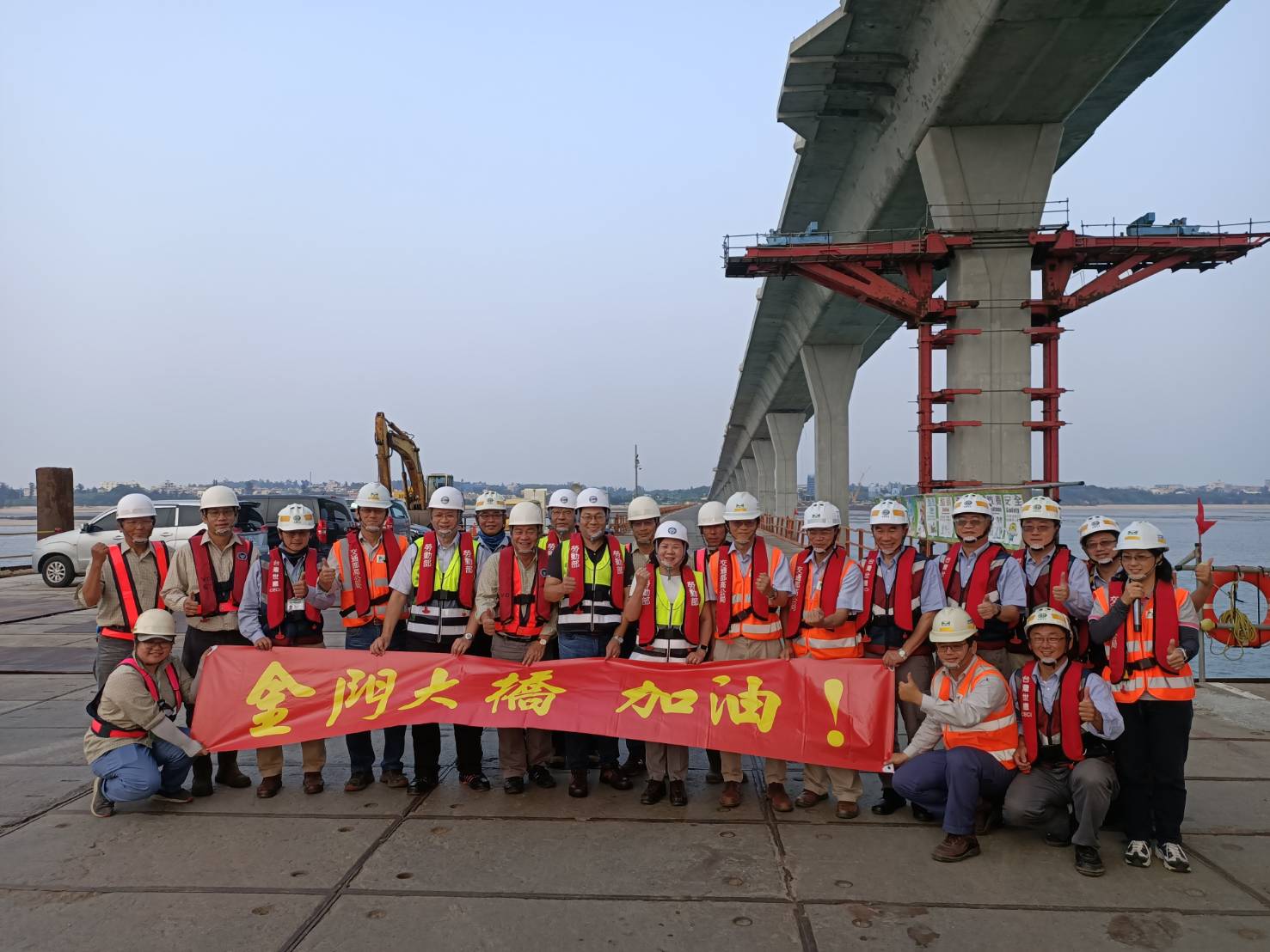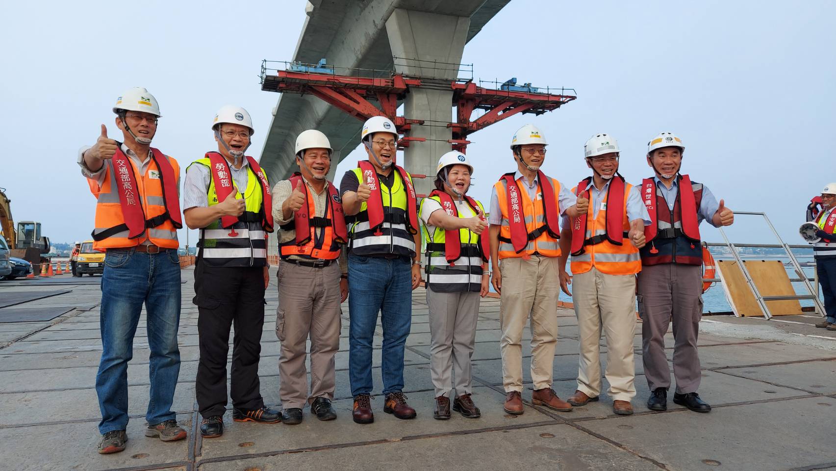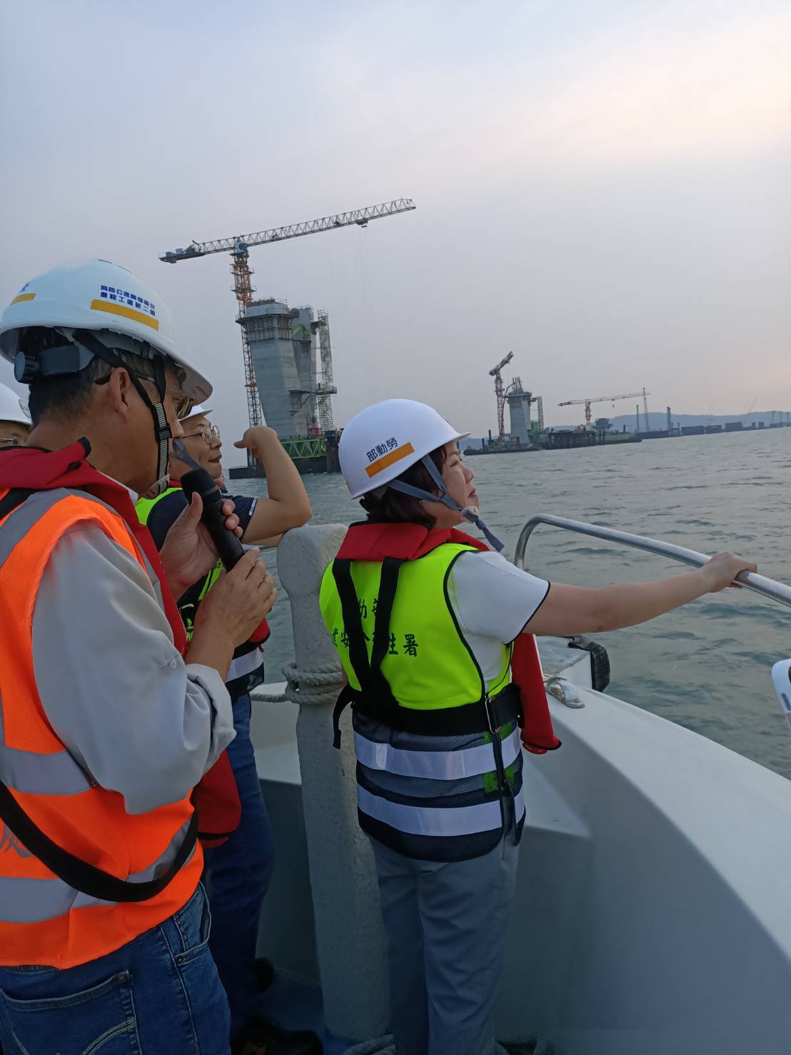 此外,許部長一行人並視察正加緊趕工中之「金門大橋新建工程」,由主辦機關--交通部高速公路局陳國隆副局長及設計監造單位--台灣世曦公司李順敏總經理親自簡報說明。金門大橋是一座連結金門本島(大金門)金寧鄉與烈嶼鄉(小金門)的海上橋樑,該橋全長5.4公里,其中跨海橋長4.8公里,深槽區水位深達23公尺,主橋部分共有五塔六跨,橋塔高近80公尺、最大跨徑達到200公尺。本工程除量體規模大外,其特殊之地理環境對施工人員更是一大挑戰,施工期間需克服海象、地質、氣象及離岸作業等種種不利因素,故施工環境相較陸地工程或台灣本島相關橋梁工程,顯得更加之艱難,因此,許部長特別提醒施工團隊務必將工程安全視為首要任務,同時也搭乘巡邏船逐塔視察工地相關防護作為,並為第一線辛苦工作的施工團隊加油打氣。